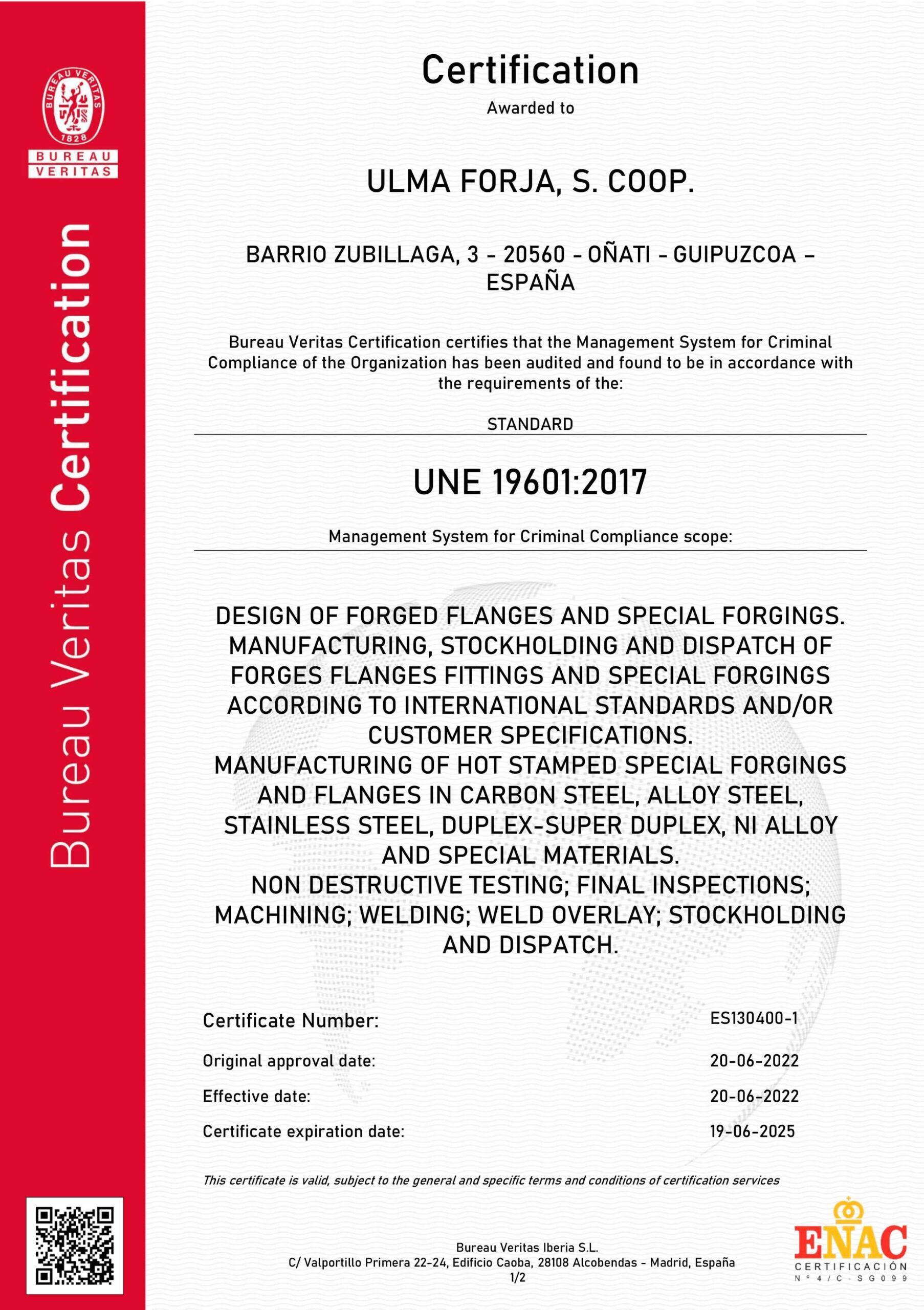 En ULMA Forja S. Coop. tenemos implantado un Sistema de Compliance certificado conforme a la norma UNE 19601 de sistemas de gestión de compliance penal, que tiene como objetivo promover un comportamiento profesional, ético y responsable por parte de las personas de ULMA tanto a nivel interno como frente a terceros en general, para: